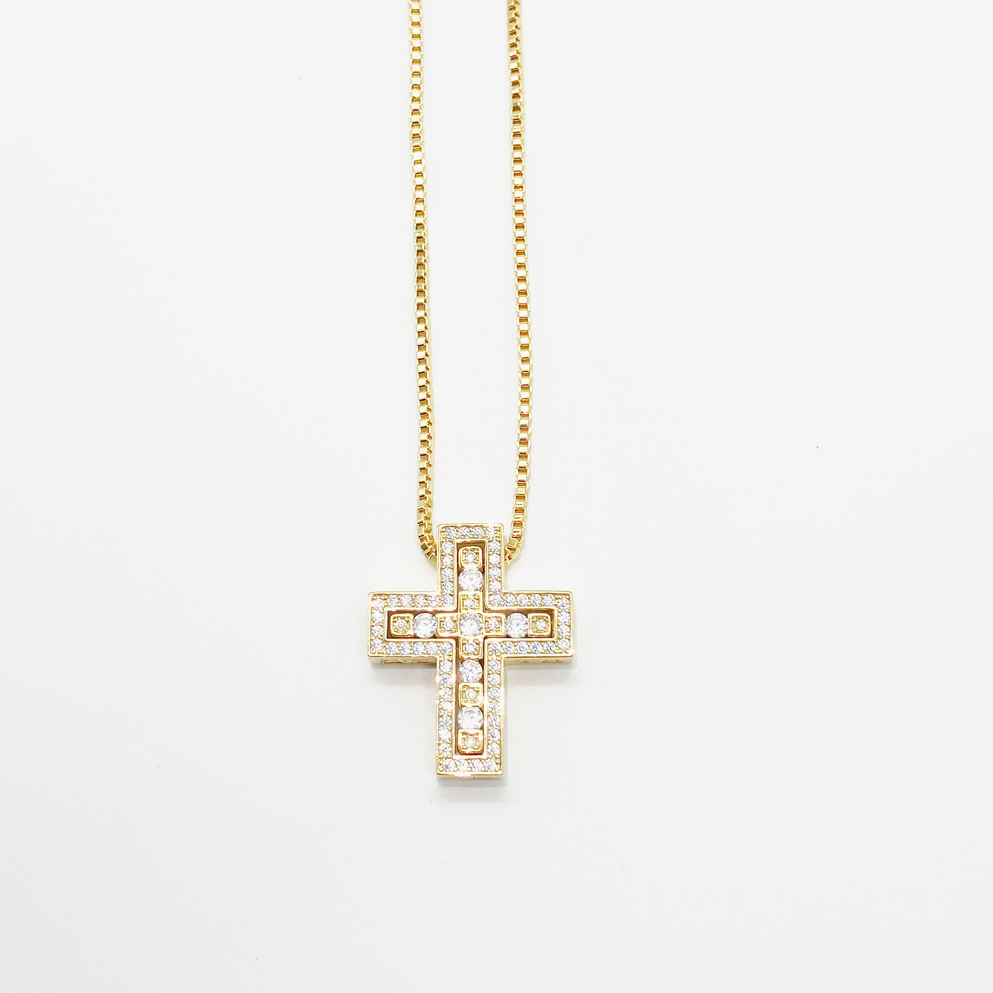 デザインが魅力的な、クリスタルクロスペンダント&ネックレス。上質な光沢を放つゴールドボックスチェーンに、存在感あるクロスペンダントが揺れるデザイン。男女問わず、恋人へのギフトにも最適です。